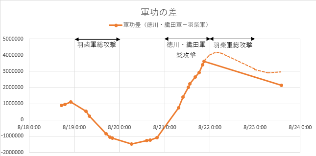 ちなみに点線で示したのは8/22時点での私個人の予想です。8/22は羽柴軍の総攻撃ですが、徳川・織田軍の大手柄温存効果もあるので、1回目の総攻撃よりは緩やかに盛り返すと予想した線です。しかし、結果を見ると、1回目とあまり変わらないくらいの反撃だったようですね。