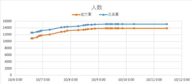 細かく見ると(データの間隔が一定でないのでわかりにくいですが)、深夜に佐竹軍が少し押し返している感じです。