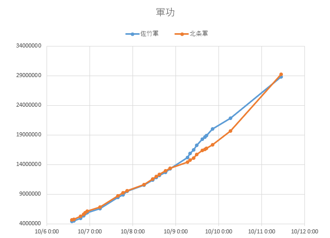 佐竹軍の総攻撃で大きく差が開いたものの、翌日の北条軍の総攻撃によって僅差で逆転という感じです。残念ながら、北条軍の総攻撃が始まってすぐにステルスに突入したので、肝心な部分の変化はよくわかりません。
