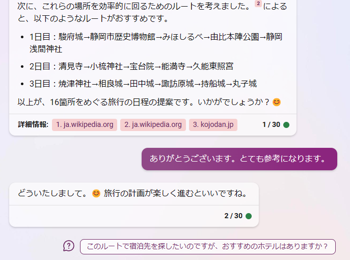 サンプルとして、「~の旅行の日程を考えてください」というのがあったので、試しに城めぐの静岡イベの日程を考えてもらうことにしました(すでに静岡イベは達成済みだけど)。
