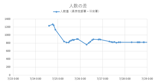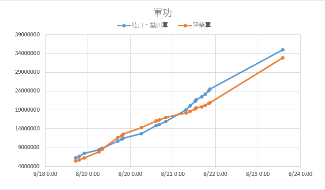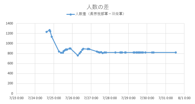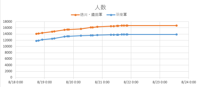まず、参加人数の変化は次のとおり。8/20 前半に徳川・織田軍の人数増加がなまりますが、その後再び人数差が少し開いています。