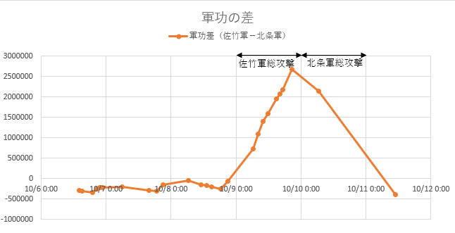 前半は北条軍がずっと優勢です(佐竹軍の軍功-北条軍の軍功で示しているので値がずっとマイナスです)。