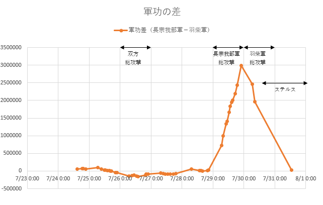 今回も軍功差と人数差をグラフにしてみました。