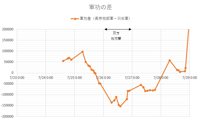 軍功も当初は長宗我部軍のほうが高かったのですが、下図のように羽柴軍が増えるにつれて軍功差も縮まり、その後の双方総攻撃で羽柴軍が優勢となっています。しかし、総攻撃翌日には長宗我部軍が巻き返し、ほぼ差が無い状態に...。
