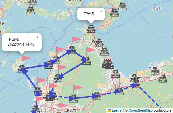 折り返しでもないのに2度通ることがあるんだ!と思っていたら、岡豊城と介良城も2度通って行きました (愛媛から南下して高知に入ってきたときと、ぐるっと回って戻ってきて西に進むとき)。